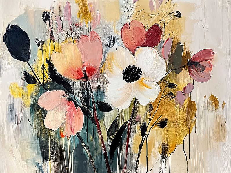 Flowers | Blossom Burst - Dieses Blumenbild zeigt eine lebendige Sammlung abstrakter Blumen, vorwiegend in Rosa-, Gelb- und Schwarztönen, mit dynamischen Pinselstrichen und Farbspritzern.