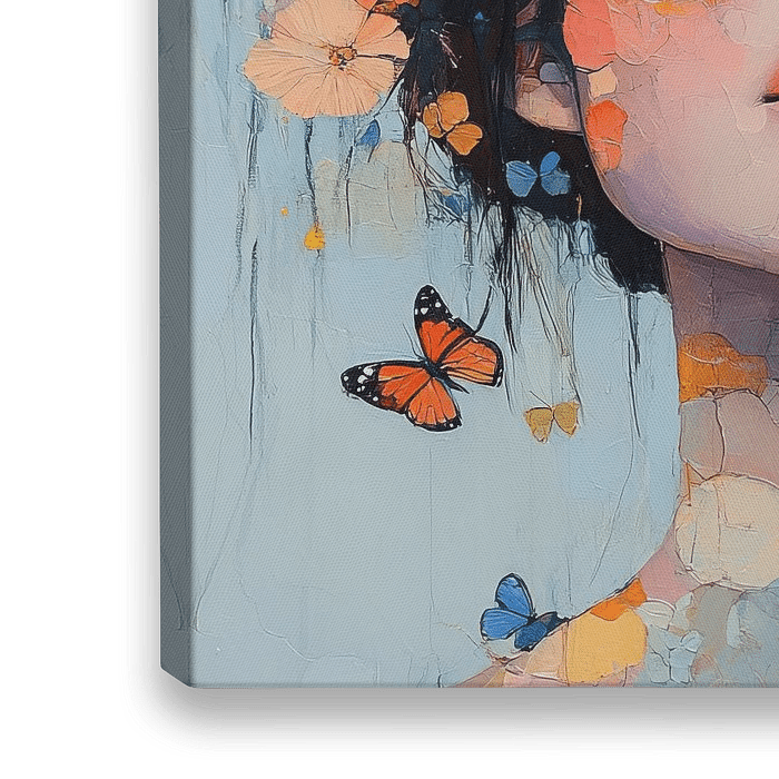 Details: Frauenbild, Blumenbild, Schmetterlinge, moderne Kunst, Porträtmalerei, Blumenporträt, Sommerstimmung, Frauenporträt, farbenfrohe Malerei, Spiegelungen