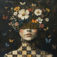 Floral Face - Dieses Frauengemälde zeigt ein Gesicht, das mit einer farbenfrohen Szene aus verschiedenen Blumen und flatternden Schmetterlingen bedeckt ist, alles vor einem dunklen Hintergrund mit einer Halskette in Patchwork-Optik.