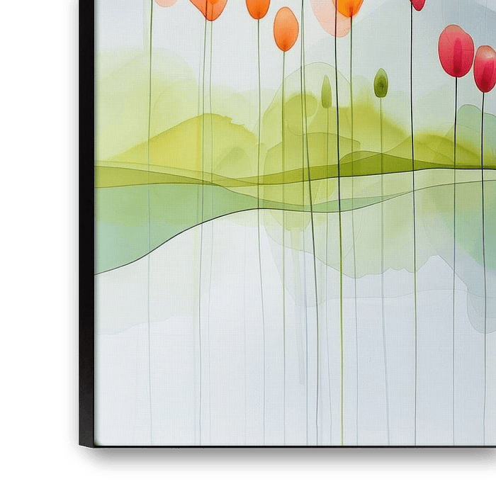 Dieses Gemälde zeigt eine heitere und ätherische Komposition aus zarten Blumen, die in sanften, durchscheinenden Farbtönen von Rosa, Orange, Grün und Gelb gehalten sind. Die Blumen wirken schwerelos und schweben in einer abstrakten Landschaft, wobei lange, dünne Stängel sie mit dem subtil geschichteten Hintergrund verbinden. Der Hintergrund besteht aus fließenden Aquarellflächen in Grün und Blau, die an sanfte Hügel oder einen nebligen Horizont erinnern. Das Ganze strahlt ein Gefühl der Ruhe und Einfachheit aus, wobei die transparenten Farben und organischen Formen eine fast traumhafte Atmosphäre schaffen.