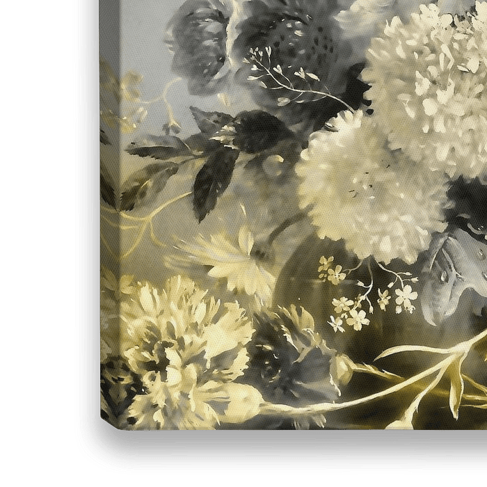 Realistische Blumenmalerei als Stilleben, die vom Mondlicht in den Farben Beige, Creme, Gold, Bronze, Ocker und Grau beleuchtet wird und somit einen ganz besonders balancierten Look hat.