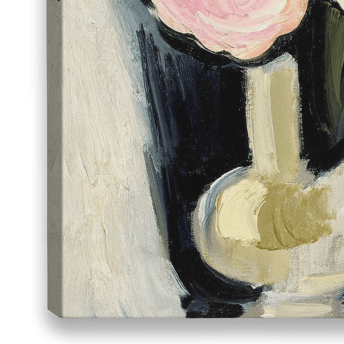 Eine Malerei eines Stillebens mit Blumenvase und verschiedenen Rosen in sanften und harmonischen grünen und beige Farben.