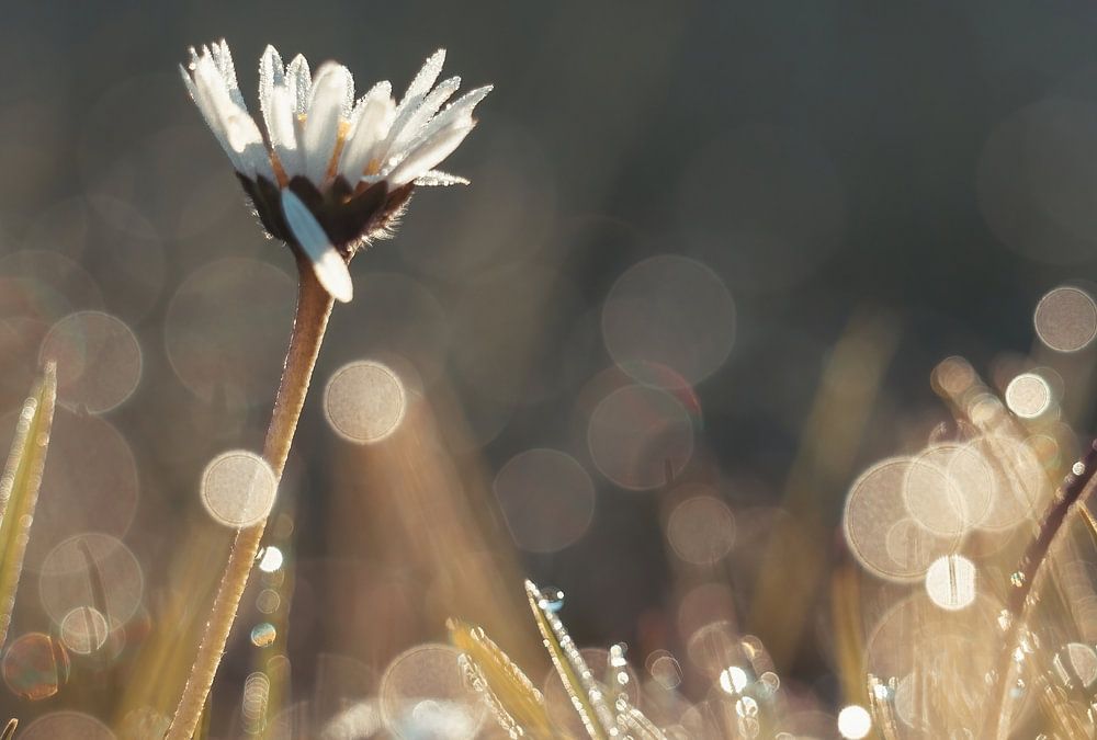 Nahaufnahme eines Gänseblümchens im mit Tautropfen bedeckten Gras. Das Sonnenlicht erzeugt ein schimmerndes Bokeh.