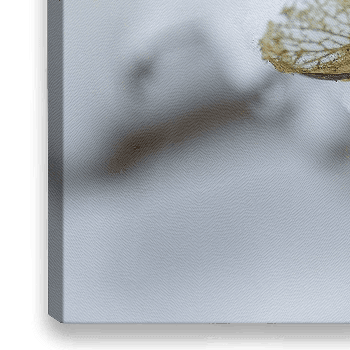 Nahaufnahme eines verfaulten Blattes einer Kletterhortensie, mit Schnee bedeckt, und mit grauem Hintergrund