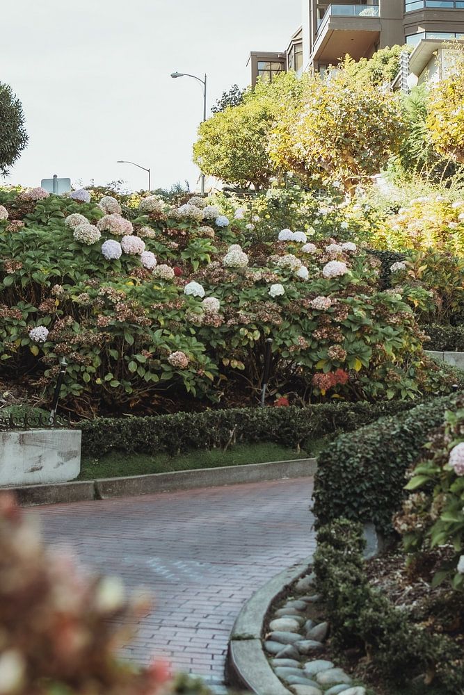 Rosa Hortensien an der berühmtesten und kurvenreichsten Straße der Welt: Lombard Street. Im Spätsommer und Frühherbst standen wir am Fuße dieser Straße.