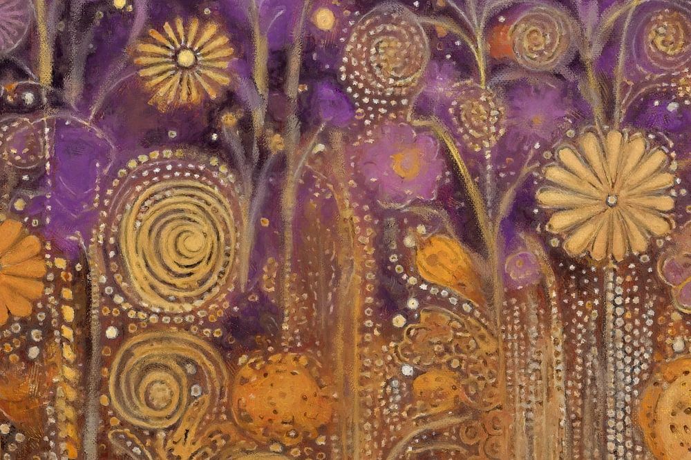 Dieses Werk zeigt ein farbenfrohes Blumenfeld vor dem Hintergrund eines tiefvioletten Nachthimmels. Die Blumen in verschiedenen Gelb- und Violetttönen weisen kreis- und spiralförmige Muster auf, die reichlich mit Punkten verziert sind. Der Boden des Werks enthält warme Erdtöne, die in die hellen Farben der Blumen und schließlich in den dunklen Himmel übergehen.