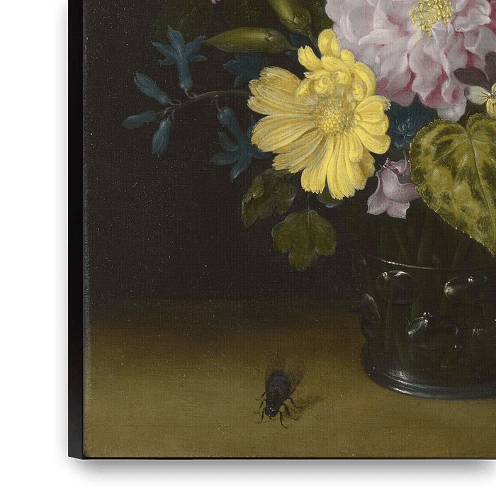 Um das Gemälde zu beleben und seine eigene Virtuosität zu zeigen, hat er einen Schmetterling, eine Raupe und eine Fliege hinzugefügt. Das Bouquet wird in ein Weinglas oder „Roemer“ (mit den charakteristischen Tröpfchen oder Glas am Stiel) gelegt, das als Vase dient.