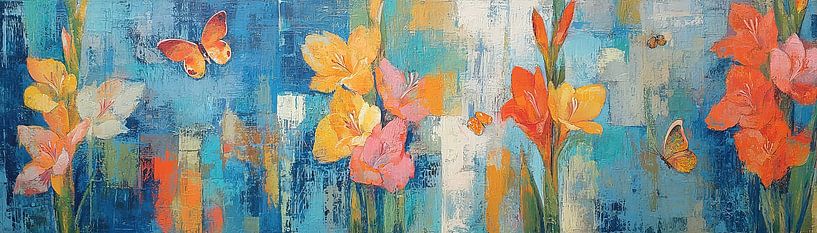 Details: Blumen, Schmetterlinge, gelb, rosa, orange, modern, abstrakt, bunt, Kunst, Gemälde