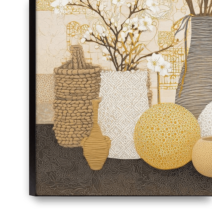 Blumen und Vasen | Floral Harmony – Dieses Stillleben mit Blumen und Vasen zeigt eine wunderschöne Vase mit weißen Blumen, umgeben von verschiedenen Vasen in Erdtönen und Gold, die die Modernität der Einrichtung perfekt ergänzen.