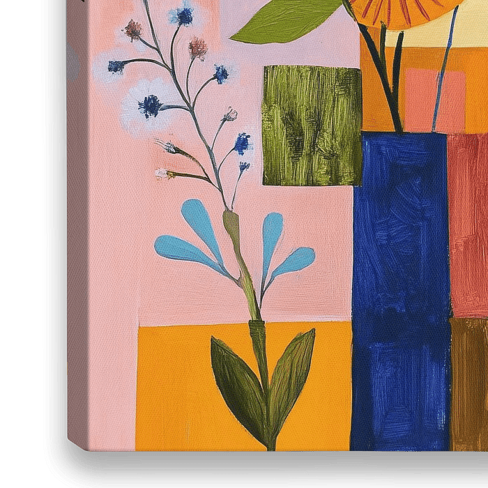 Blumen - Dieses Blumenbild zeigt eine fröhliche Ansammlung von stilisierten Blumen und Blättern auf verschiedenen geometrischen Formen und Flächen, wobei eine Palette von Pastellfarben verwendet wurde.