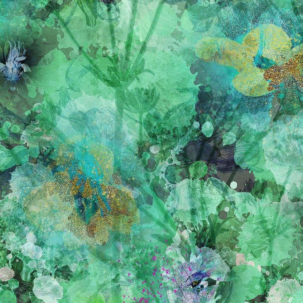 Abstrakte, malerische Impression mit Blumen. Bringt eine fröhliche, künstlerische, besondere Atmosphäre in Ihren Raum, ist aber auch sehr schön als Tapete.