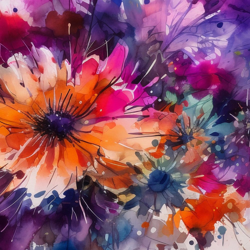 Dieses abstrakte Gemälde zeigt eine explosive Komposition von Blumen in hellen, leuchtenden Farben. Orange, Rosa, Violett, Blau und Grün spritzen förmlich von der Leinwand, als ob die Blumen in voller Blüte auseinanderbrechen würden. Es gibt keine festen Konturen - die Formen bestehen aus Pinselstrichen, Spritzern und Tropfen, die ein dynamisches und energiegeladenes Ganzes bilden.