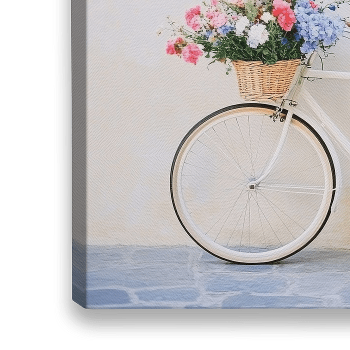 Ein freches, weißes Rad mit üppigen Blumenarrangements in zwei geflochtenen Körben steht an einer sanft gestrichenen Wand. Die leuchtenden Farben der Blüten tanzen augenzwinkernd in der Sommerluft und laden zu Abenteuern in blühenden Gärten und sonnigen Wegen ein. Ein harmonischer Anblick, der Freude und Nostalgie versprüht.