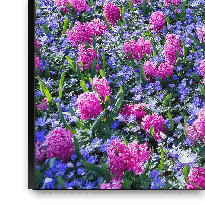 Bestelle dieses Blumen-Wandbild Blumenfeld mit rosa Hyazinthen und roten Tulpen im Keukenhof in den Niederlanden von Ben Schonewille als Reproduktion auf Leinwand, Alu-Dibond, als Poster, Fototapete oder Acrylglasbild.