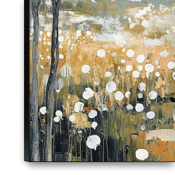 Blumenfeld - Dieses Landschaftsgemälde zeigt ein üppiges Feld mit blühenden weißen und orangefarbenen Blumen vor einem abstrakten blauen und cremefarbenen Himmel, der eine heitere und strukturierte Erfahrung der Natur widerspiegelt.