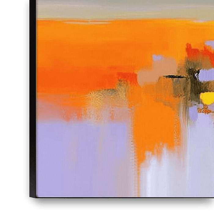 Bloemenveld - In één oogopslag grijpt die brede, vurige band van oranje je aandacht — alsof het veld zichzelf in brand heeft gezet en in vlekken en blokjes over het doek golft. Het is geen fotorealistisch bloemenveld, maar een abstracte weergave van kleurvakken en stippen die samen de illusie van een bloeiende vlakte geven. De…