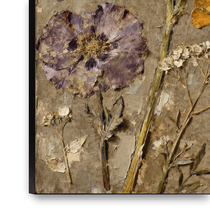 Im Zentrum dieses ausdrucksstarken Kunstwerks steht eine großformatige Blüte, die durch ihre plastische Ausarbeitung und die kraftvolle Struktur sofort Aufmerksamkeit erzeugt. Die Spachteltechnik verleiht den Blütenblättern eine reliefartige Tiefe, während die unregelmäßige Oberfläche das Licht auf vielfältige Weise reflektiert und so…