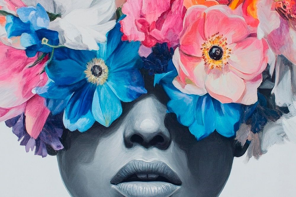 Ein faszinierendes Spiel aus Farben und Formen entfaltet sich hier: Ein stilisiertes Gesicht, sanft umrahmt von einer üppigen Blütenpracht, verleiht diesem Kunstwerk eine lebendige Energie. Die harmonische Fusion aus floralen Elementen und menschlicher Gestalt erweckt eine träumerische Atmosphäre, ideal für das Wohnzimmer, um Gespräche und Inspiration zu wecken.