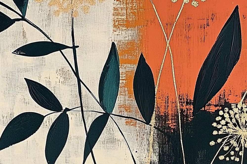 Flower art | Bold Silhouettes Against Dawn - Dieses Blumenbild zeigt elegante, stilisierte Pflanzen mit dunkelgrünen Blättern und goldenen Blüten auf einem abstrakten Hintergrund aus weißen, grauen, orangen und schwarzen Tönen.