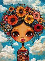 Blumenmädchen - Dieses Frauengemälde zeigt ein Mädchen mit großen Augen und einem bunten Blumenstrauß, dessen leuchtende Farben sich von dem blauen Himmel und den Wolken abheben.