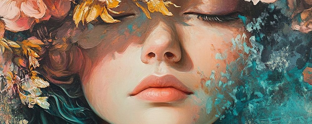Floral Portrait | Slumbering in Blossom - Dieses weibliche Porträt zeigt eine ruhige Frau mit geschlossenen Augen, umgeben von einem üppigen Blumenkranz, in dem Rosa-, Gold- und tiefe Türkistöne dominieren, die eine moderne Interpretation von Rokoko-Atmosphäre und Stille hervorrufen.
