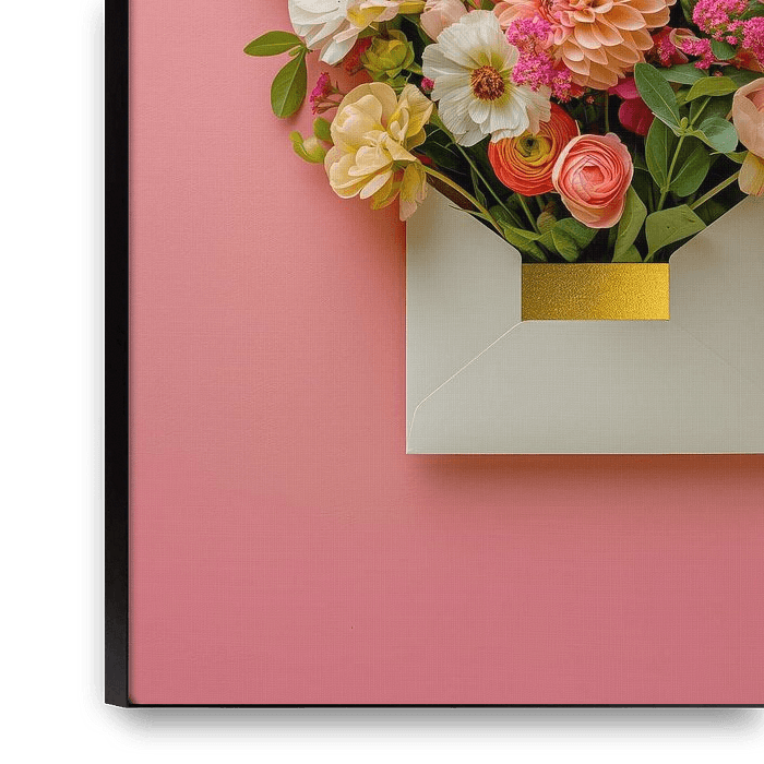 Vor einem zarten, puderrosa Hintergrund öffnet sich ein Umschlag, aus dem keine Worte, sondern Blumen hervorkommen. Blumenpost vermittelt eine Botschaft, die nicht gelesen werden muss: Farbe, Duft und Form sagen genug. Das Kunstwerk spielt mit der Idee der sprachlosen Kommunikation – eine liebe Geste, eine Erinnerung oder ein Gefühl,…