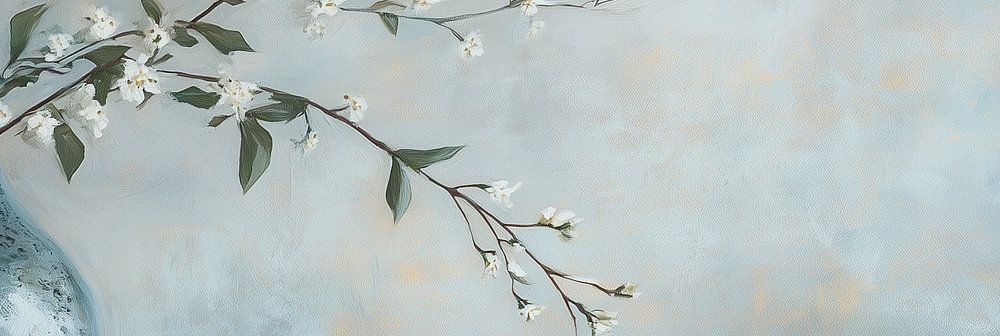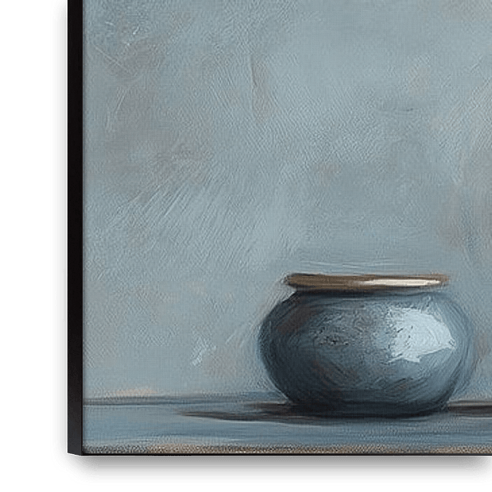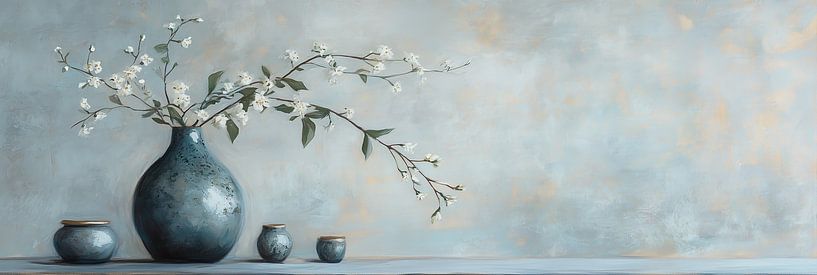 Blumenstillleben | Blue Bloom – Dieses Blumenbild ist ein Japandi-Stillleben mit einer großen blaugrauen Keramikvase und drei kleinen Töpfen, aus denen sich ein gebogener Zweig mit zarten weißen Blüten und grünen Blättern nach rechts vor einem sanften pastellblauen und beige-goldenen Hintergrund erstreckt, ein ruhiges Blumenbild und…