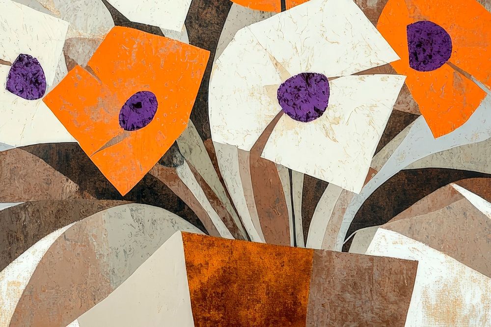 Ein harmonisches Zusammenspiel aus leuchtenden Orange- und Erdtönen entfaltet sich in diesem Blumenarrangement. Die stilisierten Blüten mit ihren sanften Konturen und tiefblauen Akzenten bringen Frische und Lebensfreude. Ideal für das Wohnzimmer, schafft es eine einladende Atmosphäre und verleiht dem Raum einen modernen, kreativen Flair.