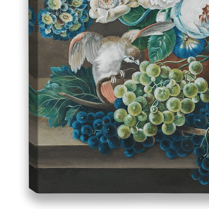 Bestelle Blumenstillleben mit Trauben, Rotschwänzchen und Nest, Leopold Zinnögger als Reproduktion auf Leinwand, Alu-Dibond, als Poster, Fototapete oder Acrylglasbild.