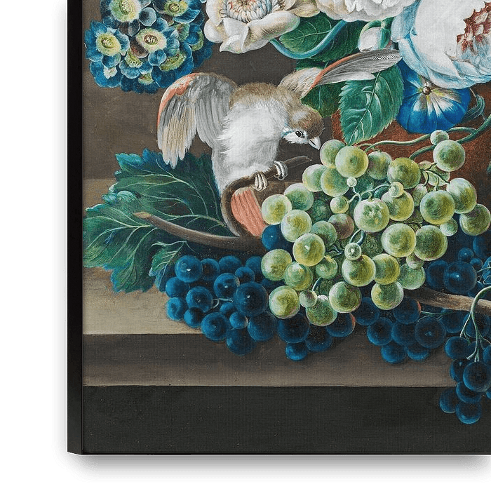 Bestelle Blumenstillleben mit Trauben, Rotschwänzchen und Nest, Leopold Zinnögger als Reproduktion auf Leinwand, Alu-Dibond, als Poster, Fototapete oder Acrylglasbild.
