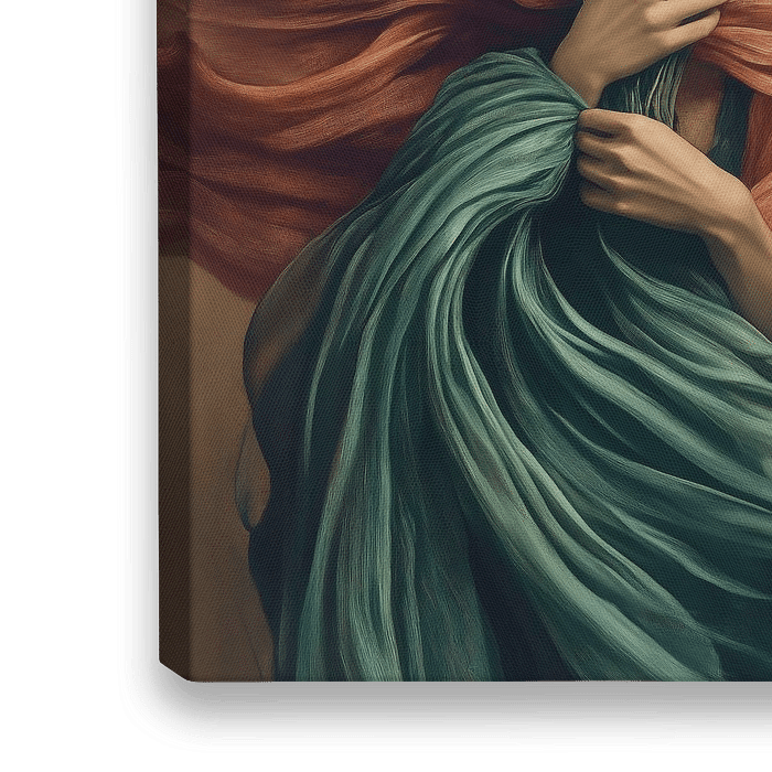 Ein surreales Porträt, in dem zarte Hände einen Strauß weißer Rosen halten, umgeben von wirbelnden Stoffen in warmen Brauntönen und kühlen Grüntönen. Die Figur bleibt verborgen, während die dynamische Komposition ein Gefühl von Bewegung und Transformation hervorruft und die Grenzen zwischen Mensch und Natur in einem eleganten Tanz aus…
