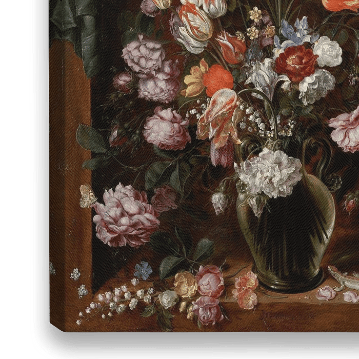 Blumenvase mit Vorhang, Jacob de Gheyn (II) (1615) Jacques de Gheyn II war einer der Begründer der Tradition der Blumenmalerei in den Niederlanden. Bei dieser außergewöhnlich großen Tafel handelt es sich wahrscheinlich um "die große Blumenvase mit Lilien", die sich im Besitz von de Gheyns Sohn befand. Sie wurde wahrscheinlich im Atelier des Künstlers aufbewahrt, um seine Fähigkeiten in einem relativ neuen künstlerischen Genre zu demonstrieren.