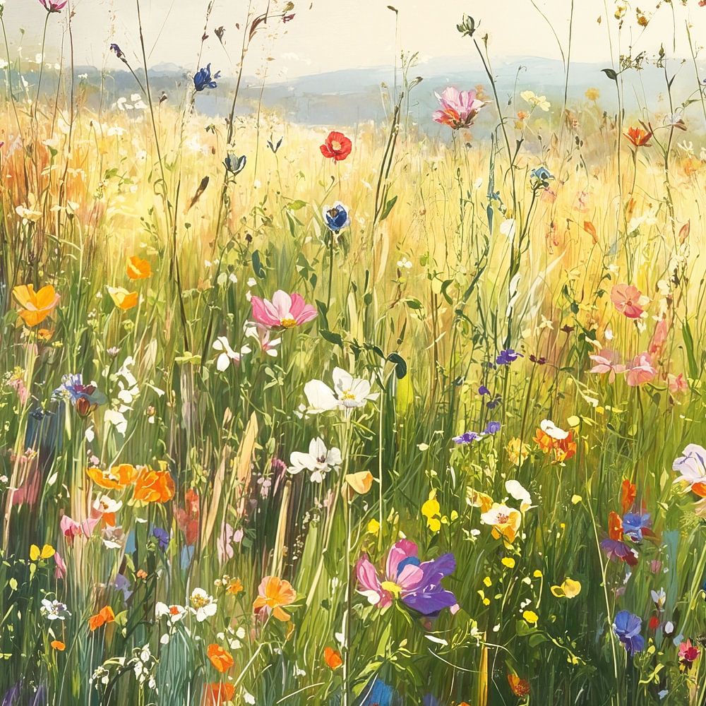 Blumenwiese Gemälde | Traumwiese - Diese Blumenwiese Gemälde strahlt eine lebendige, bunte Feld mit einer Vielzahl von Wildblumen spielerisch wiegen in einer sanften Brise gefüllt.