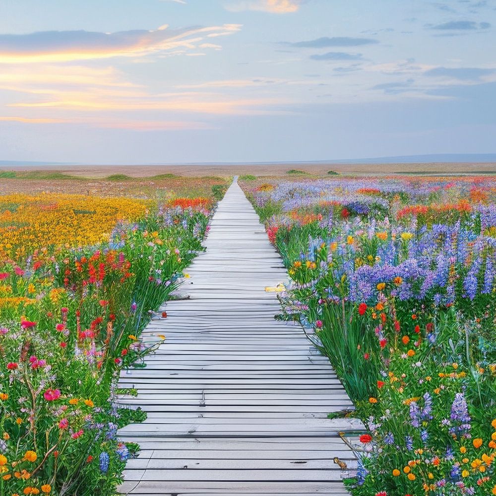 Erleben Sie die farbenfrohe Pracht einer Blumenwiese durch dieses geöffnete Fenster. Der Weg, der sich durch das blühende Feld schlängelt, schafft eine bezaubernde Szenerie voller Lebendigkeit und Frische. Ideal für Liebhaber von Naturmotive und Blumen, die ihr Zuhause mit einem Hauch von Sommer und Freude verschönern möchten.