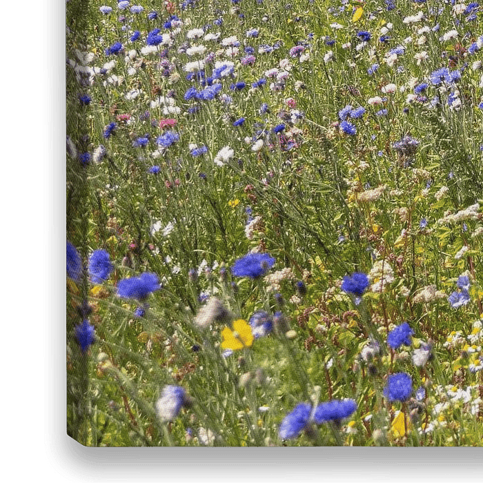 Ein sonniges, sommerliches Feld voller Blumen (Kornblumen, Feldblumen) mit einem Bauernhof im Hintergrund