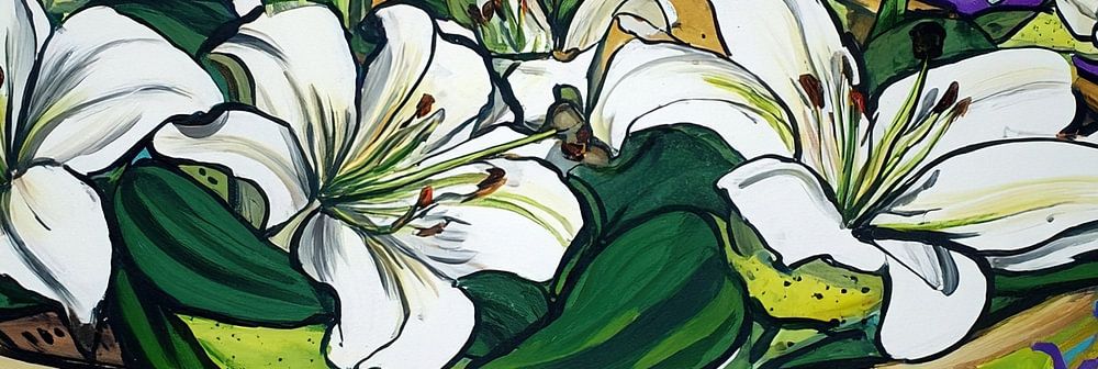 Details: Blumen, Lilien, Vase, grün, weiß, lila, türkis, modern, Kunst, bunt