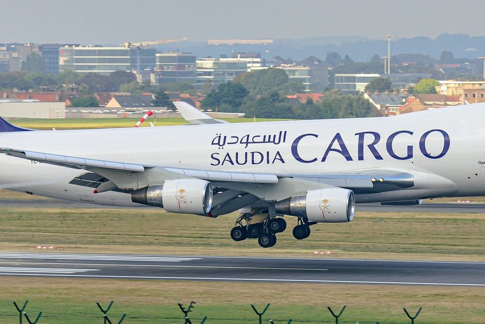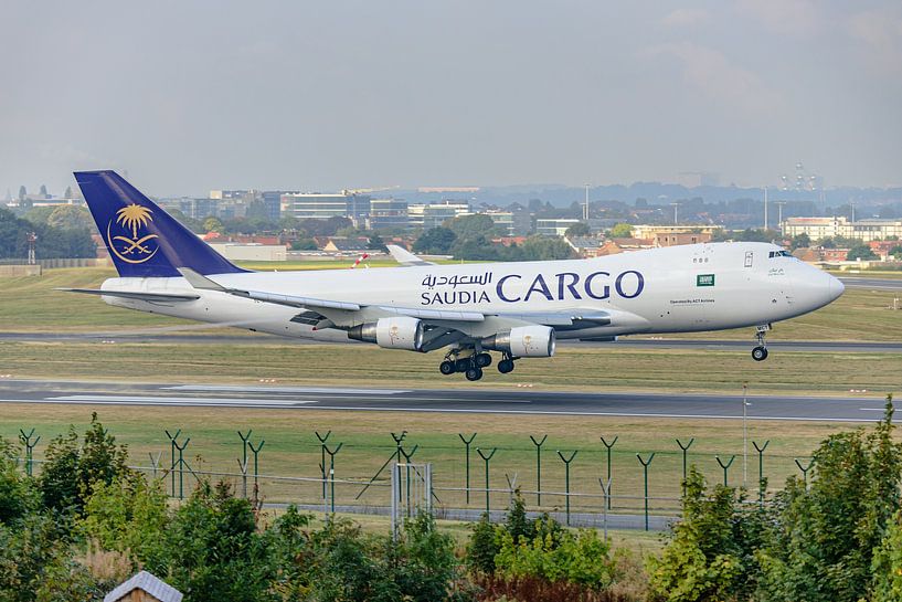 Saudia Cargo Boeing 747-400 landet auf dem Flughafen Brüssel, Registrierung: TC-MCT. Das Flugzeug wird von ACT Airlines eingesetzt, daher die türkische Registrierung. Dieses Foto wurde am 18. September 2016 aufgenommen, kurz bevor dieses Frachtflugzeug sein Fahrwerk auf der Startbahn des Flughafens Brüssel ausfahren sollte.