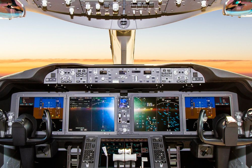 Das ultramoderne Cockpit des Boeing 787-8 Dreamliners während des Reisefluges (maschinell bearbeitet).