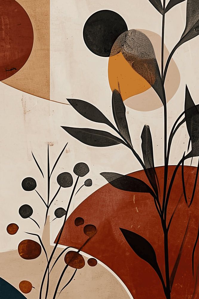Zu sehen ist ein Boho-Gemälde in den Farben Beige, Schwarz, Braun und Schwarz.