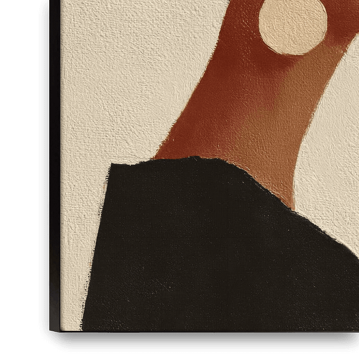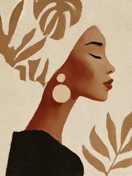 Ein warmes und minimalistisches weibliches Porträt im Profil, ausgeführt in weichen Sandtönen und reichem Terrakotta. Die geschlossenen Augen und die ruhige Pose verleihen dem Werk eine heitere, fast meditative Ausstrahlung. Die grafischen Blätter im Hintergrund und die großen runden Statement-Ohrringe sorgen für einen modernen…
