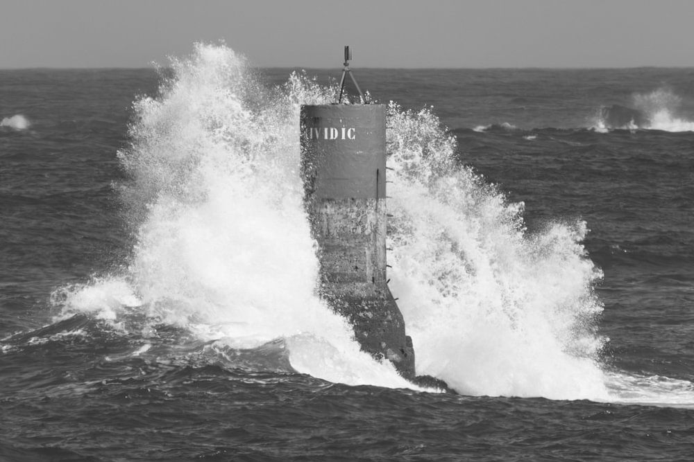 Diese kraftvolle Schwarz-Weiß-Fotografie fängt auf dramatische Weise die rohe, ungezähmte Energie des Meeres ein. Eine robuste Boje, ein einsamer Wächter im weiten Ozean, wird von einer wütenden Welle aus weißen, krachenden Wellen verschlungen. Die monochrome Farbpalette verstärkt die Intensität der Szene und hebt die Textur des aufgewühlten Wassers und den starken Kontrast zwischen der dunklen, aufgewühlten Tiefe und der explosiven Gischt hervor.
