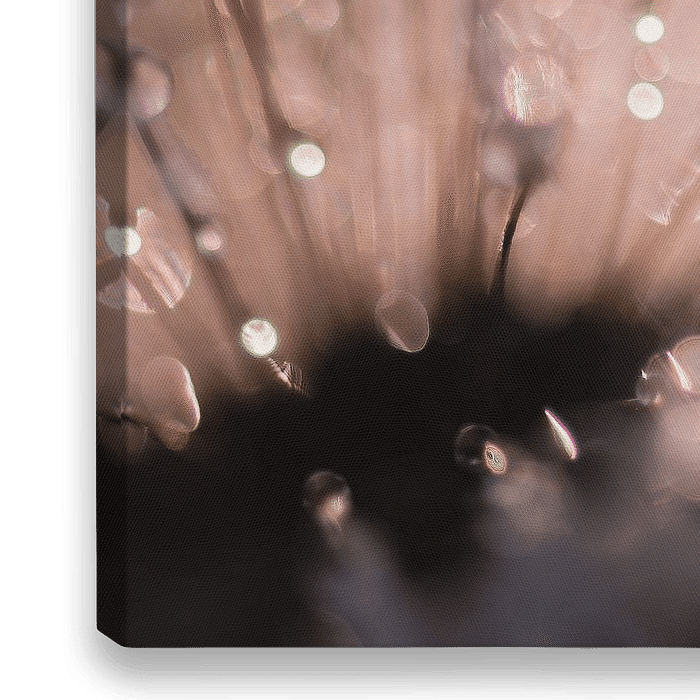 Makro eines toten Löwenzahns mit Tautropfen, die im Sonnenlicht ein schönes Bokeh erzeugen.
