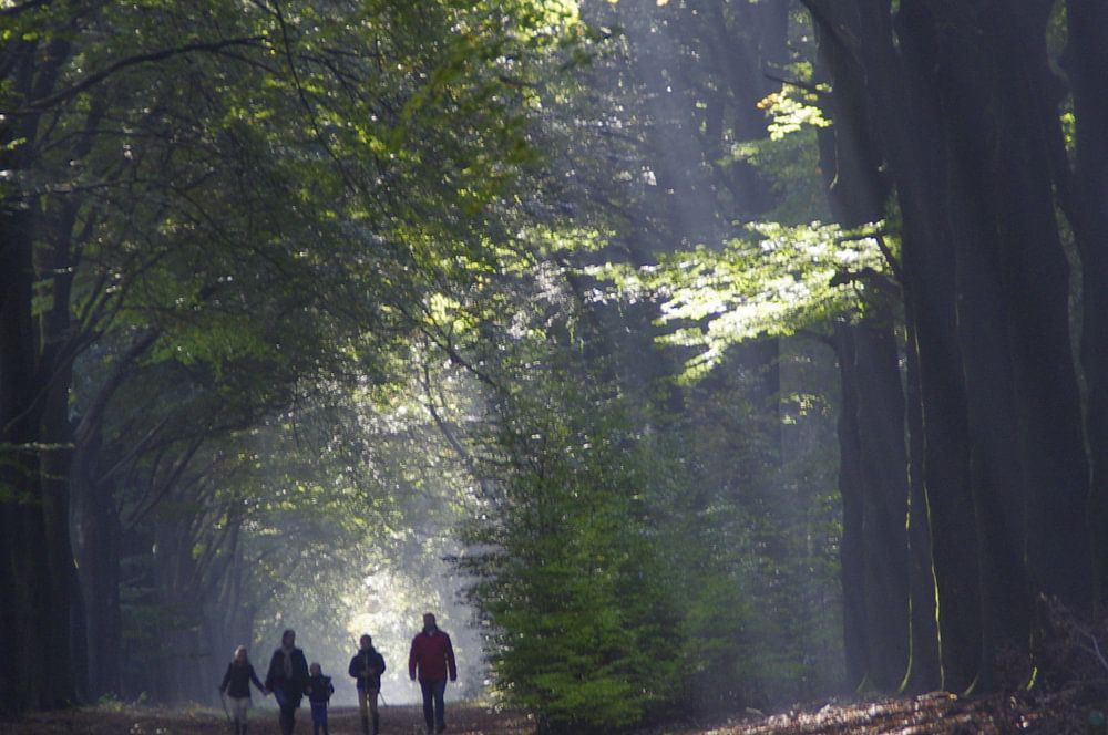 Bomen met zonnestralen en een groep mensen te Hoogbuurlo