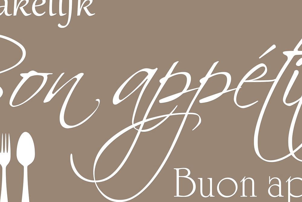 Guten Appetit, leckeres Essen, gutes Essen. Die Hintergrundfarbe ist hellbraun, die Buchstaben sind weiß. Text auf Leinwand oder anderem Material