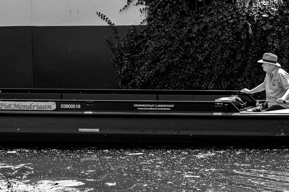 Ein Mann fährt in seinem Boot auf den Grachten von Amersfoort in der Nähe des Havik. Eine gewisse Abkühlung an einem schönen Sommertag.
