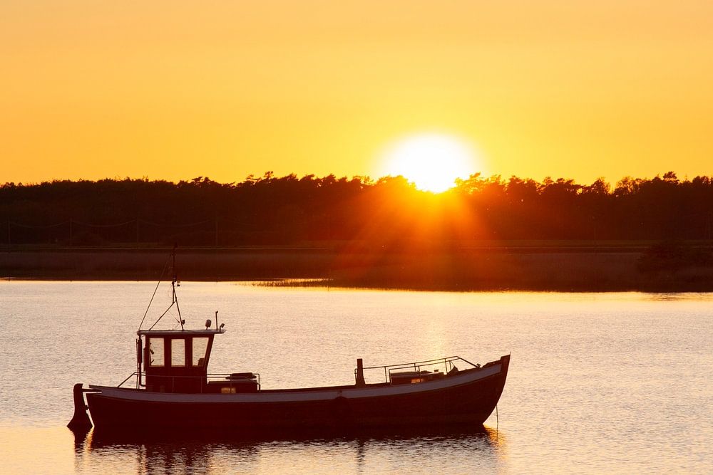 Fischerboot bei Sonnenuntergang, Insel Ummanz, Insel Ruegen, Mecklenburg-Vorpommern, Deutschland