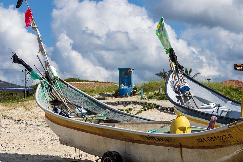 Zwei verwitterte Fischerboote liegen ruhig im Sand unter einem weiten, wolkenverhangenen Himmel. In jedem Detail sind Spuren des Alltags und der Tradition zu erkennen, von der Maserung des Holzes bis hin zu den Fahnen, die sanft im Wind wehen. Ein Moment der Stille, geprägt von menschlicher Präsenz und dem Rhythmus der Küste.