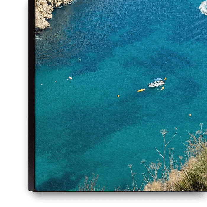 Bestelle das Foto Bootfahren in einer Mittelmeerbucht von Adriana Mueller als Reproduktion auf Leinwand, Alu-Dibond, als Poster, Fototapete oder Acrylglasbild.