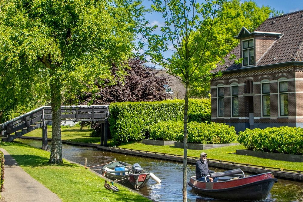 Was wir in diesem Werk sehen, ist eine idyllische Szene aus einem typischen niederländischen Dorf. Eine schmale Gracht schlängelt sich an alten Häusern mit Strohdächern vorbei, während eine Holzbrücke die beiden Ufer miteinander verbindet. Zwei Personen in einem kleinen Boot fahren leise unter der Brücke hindurch und genießen die Stille und das klare Wasser. Ein Detail, das nicht sofort ins Auge fällt, aber das Bild besonders macht, ist die niederländische Flagge, die stolz neben dem Haus weht. Sie ist ein subtiles, aber starkes Symbol der Verbundenheit mit diesem Ort und dem Land. Auch die Schatten der Bäume, die spielerisch auf dem Wasser tanzen, verleihen dem Werk eine zusätzliche Tiefe.