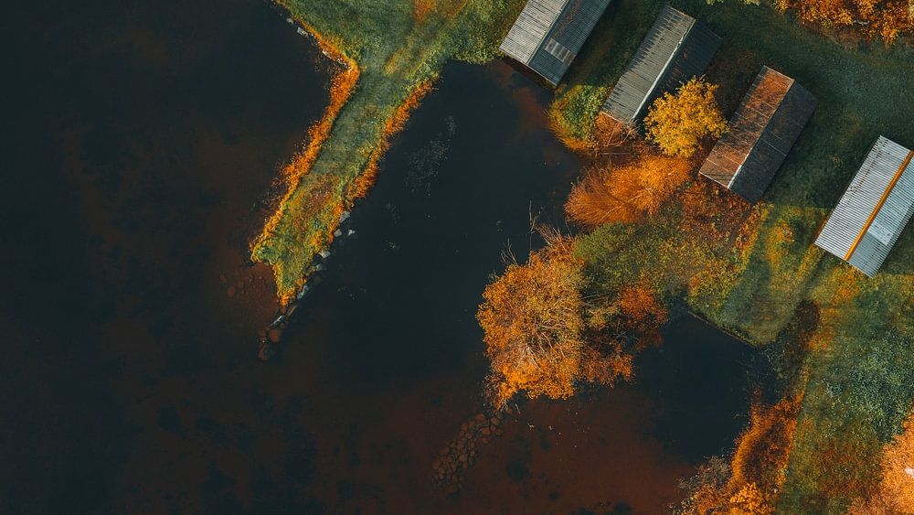 Auf diesem Luftbild sieht man eine kleine Gruppe von Holzboothäusern am Ufer des Siljansees, unweit von Leksand, umgeben von Bäumen in warmen Herbstfarben. Das Foto wurde direkt von oben aufgenommen, wodurch die Formen der Landschaft fast grafisch wirken. Die dunklen Farbtöne des Wassers bilden einen schönen Kontrast zu den Gold-,…